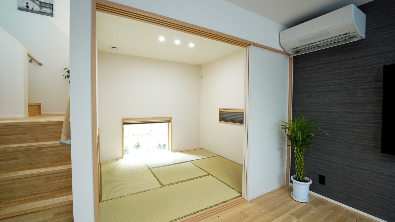 「これはやっぱり欲しかったですね」とご主人が言われるのがリビング横の和室。ごろんと横になれるスペースはやはり貴重ですよね。雪見窓も付いていますが、そこから見える景色はご主人の手作りの庭なんです。