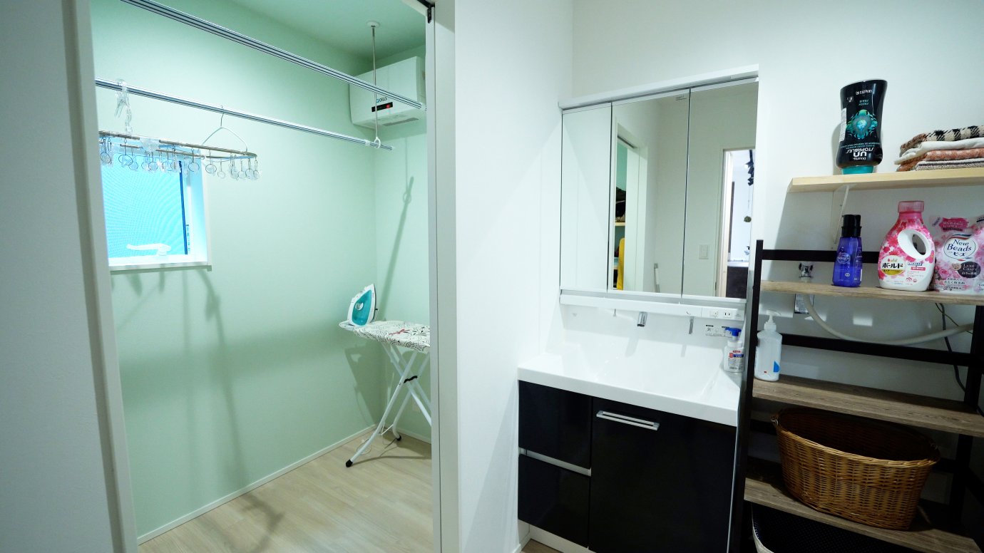 バスルーム、サニタリー、トイレと水回りスペースは連続していますが、特徴的なのはランドリースペース。奥様曰く、「洗面所やバスルームと同じスペースではなく、ランドリールームに扉を設けて独立させたのは、干してある物を見られたくないし、お客さんにも気を使わせたくなかったからです。気兼ねなく使えて、結果的に大正解でした」