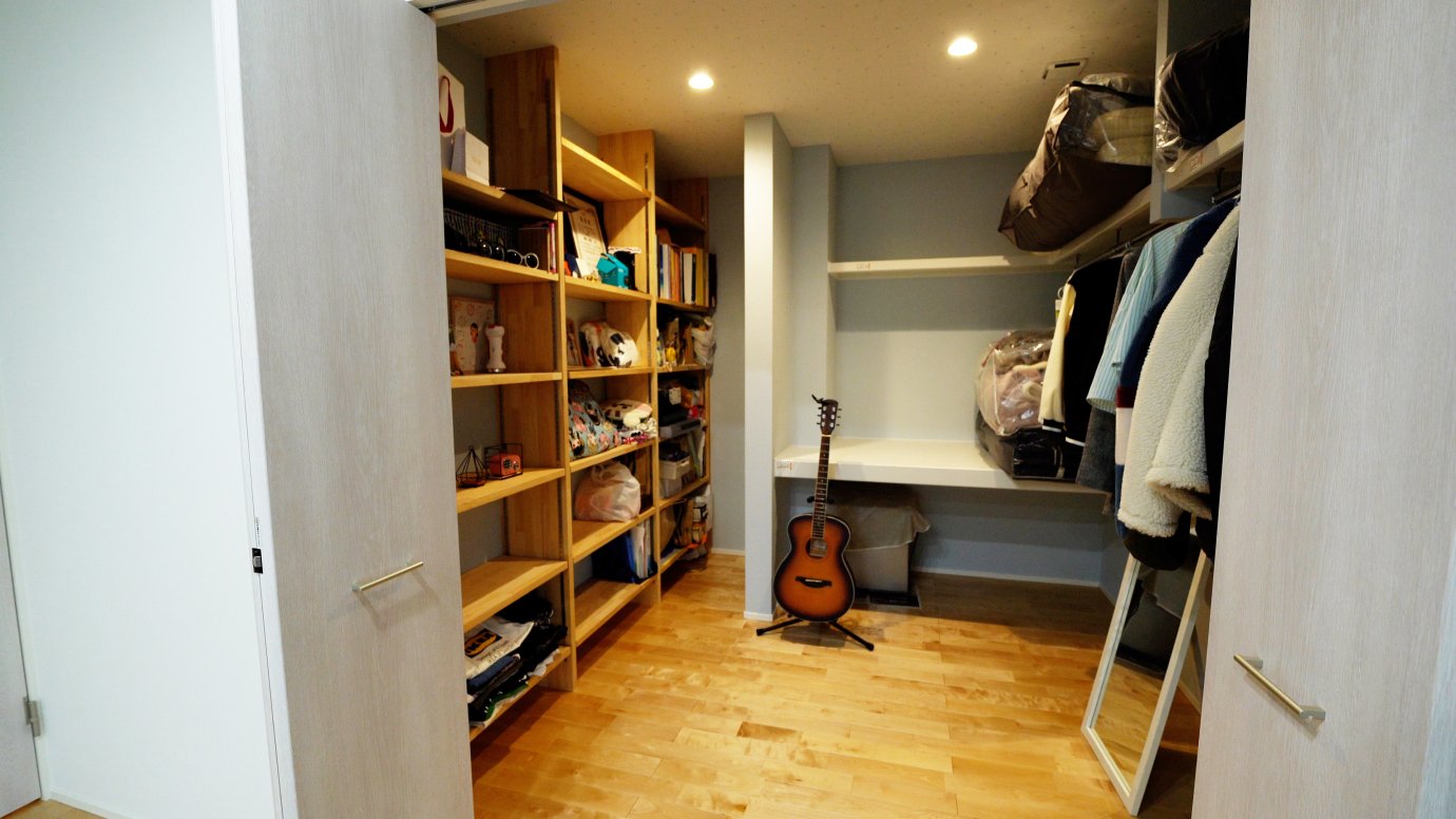 寝室とお嬢さんが帰って来た時の部屋がある2階。寝室にもウォークインクロゼットがありますがお嬢さんの部屋にある引き戸を開けると、そこも、部屋ですか?と間違うほどの広さのウォークインクロゼットがあります。6畳ほどの広さなので、将来は立派にお部屋としても使えるほどです◎。