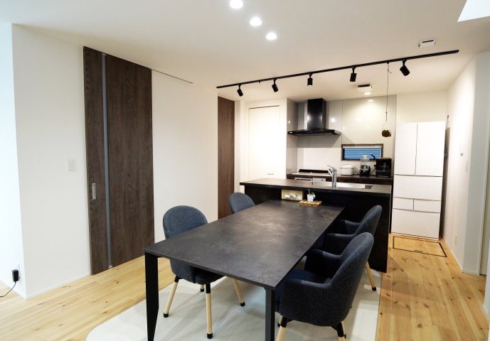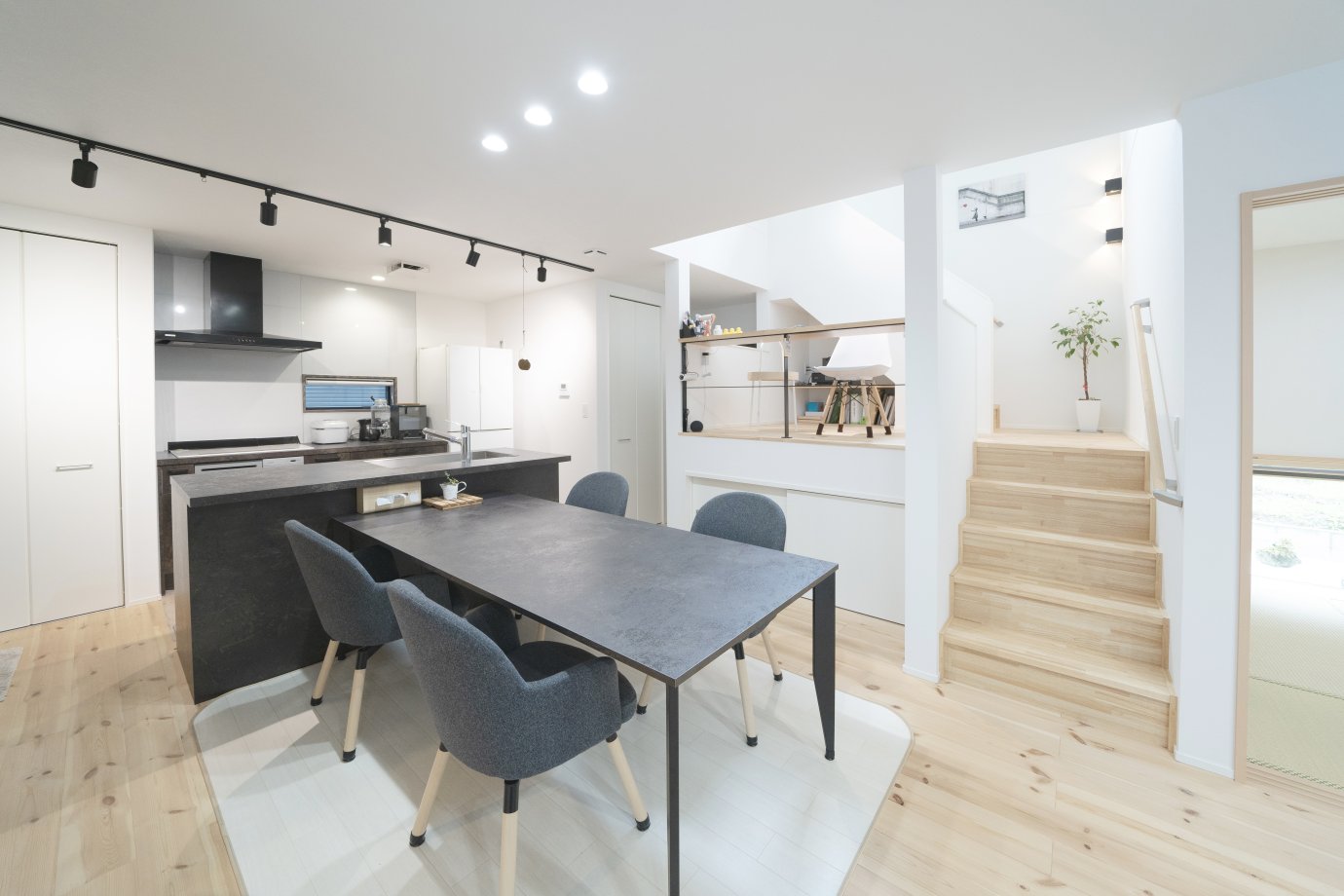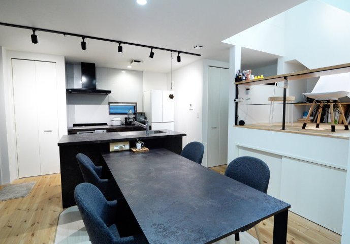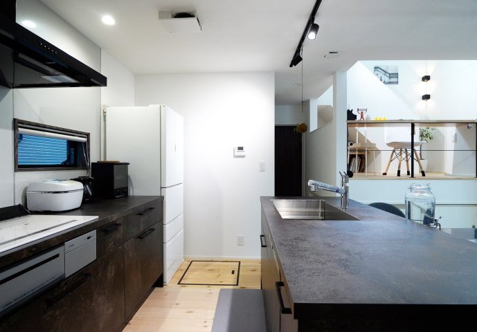 LDKの主役はやはりキッチン。外観のイメージをそのまま持ってきたようなアーバンテイストなグラフテクトです。フォルムはアイランド。シンクとコンロがセパレートになったタイプです。キッチンスペースの両端にはパントリーが設けられ、いつでもすっきりと片付けられるのもいいですね。お料理しながらテレビを観られるのもお気に入りだそうです。ご主人の中二階と同じでこちらは女性がキュンとするポイントですよね◎