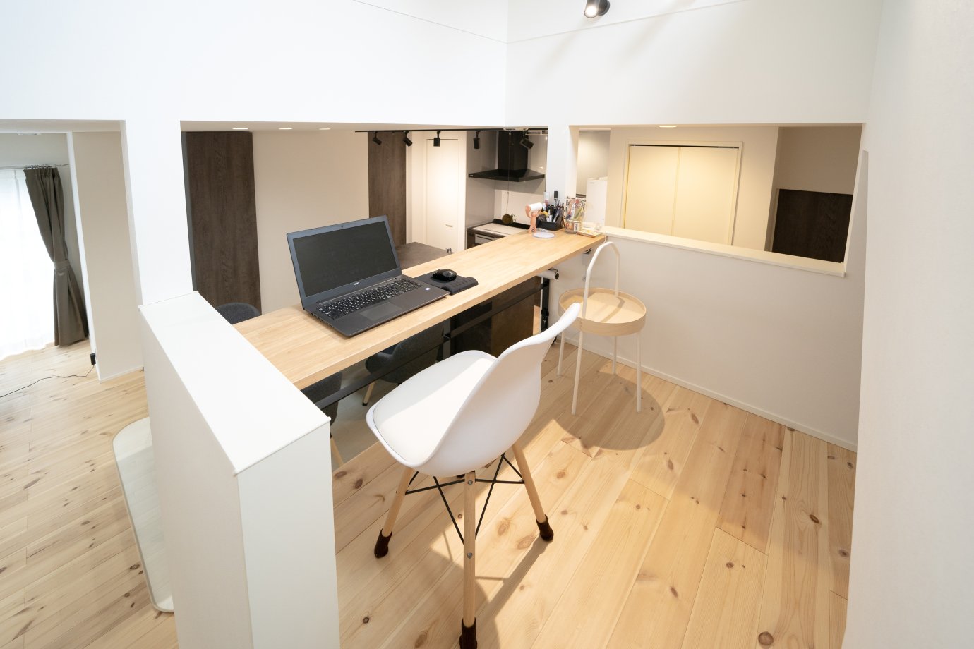 熊本のモデルハウスを見て、これだ!と直感したご主人。リビングに入ってすぐにリビング階段があり、少し上がるとカウンターを備えた2畳強のスペース。そこが中二階でした。その上が吹き抜けになっていて、とっても広々とした空間です。「もう、ひとめぼれでした。ここからリビングを見下ろしている自分が想像できました。何だか、男心をくすぐられてしまったようです(笑)」と、少し照れたような笑顔が印象的でした。