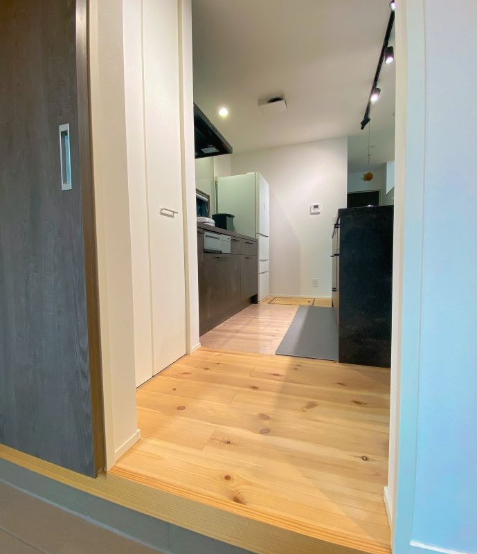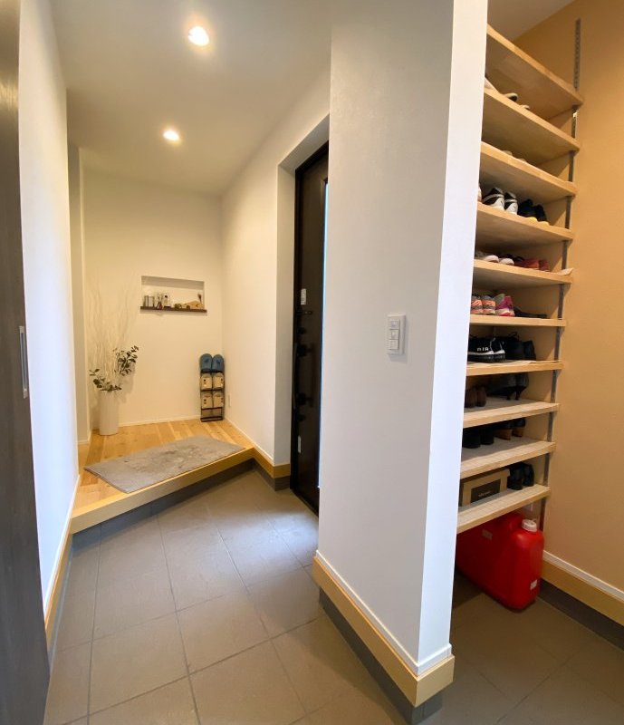 玄関入ってすぐに靴や傘などが見えない造りだとスッキリですね◎ ここからキッチンにつながっているので、買い物してきたものを収納するのにも便利!