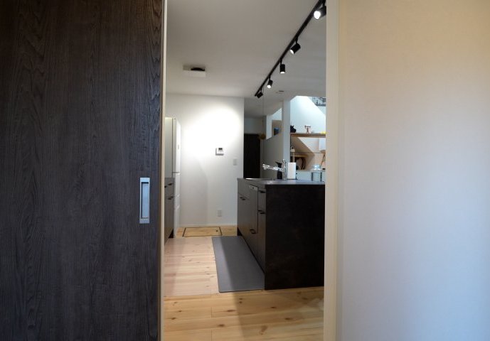 「これはもう本当に助かっています!」とは奥様の言葉。玄関を開けて右側がリビング、左側の引き戸を開けるとキッチン。「ここにどさっと買い物した荷物を置けるので、その後の作業がとってもラクなんです」と、家事ラクと時短が実現した提案に大満足です。