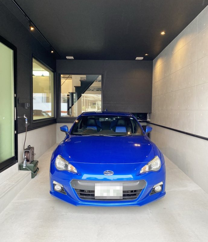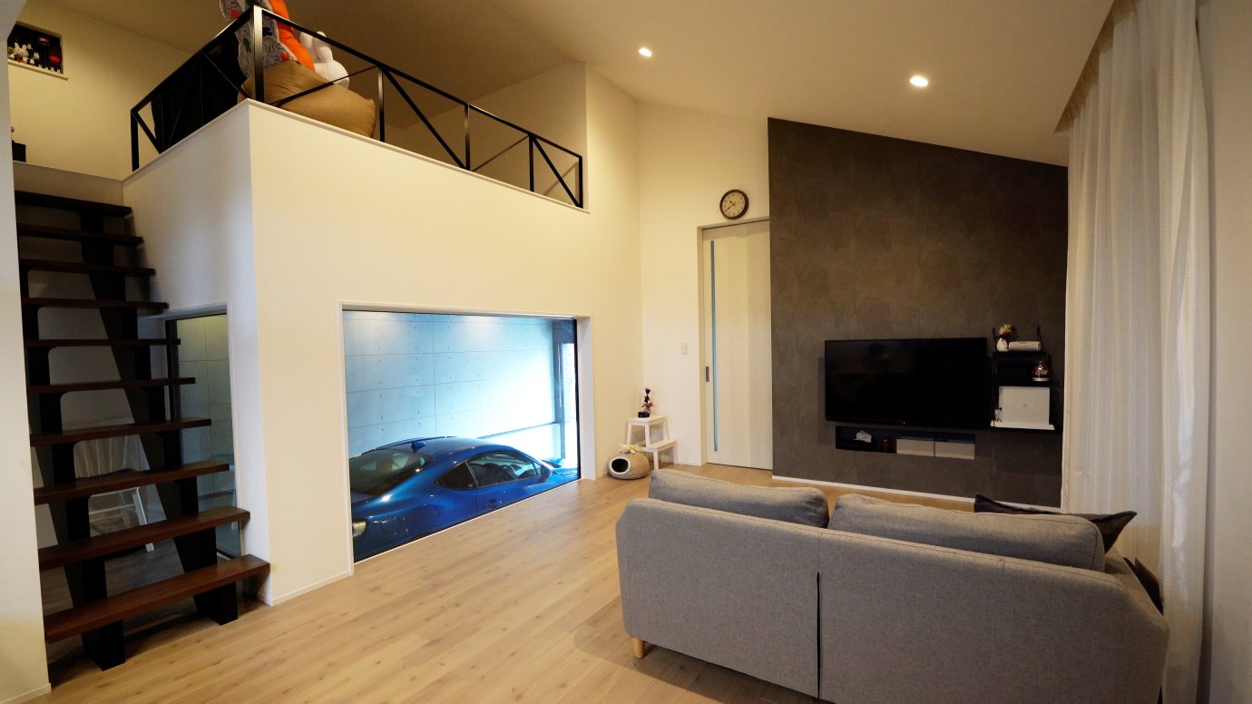 車好きのオーナー様。『リビングからお車を眺めたい』という要望を叶えるため、一般的には家の端に設けるインナーガレージを家の中心に。