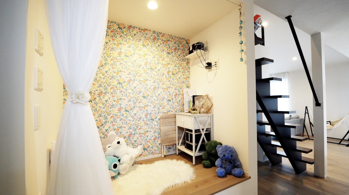実はこのヌックの場所、最初は扉が付いたクローゼットを予定していたそう。奥様がこのスペースをヌックにされた理由は?「だって主人だけがインナーガレージを実現して羨ましかったから…」と、笑いながら言われる奥様。「このスペースだけは自分だけの世界観でやってみようと思って、他とは全く違うカラーリングになっていてとっても気に入っています」と満足されています。