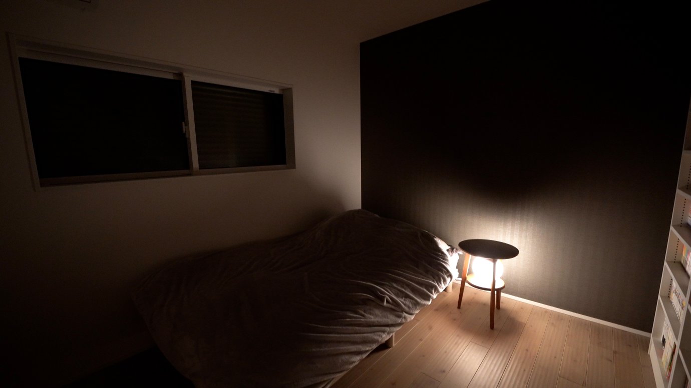 キッチン前を通って廊下を進むと寝室です。実はこの寝室。天井照明をつけていません。「寝室ってぐっすり眠る場所ですよね?だったら思い切って、照明を付けないでおこうかなって思って…」と話してくれた奥様。たしかに言われてみればその通りです。「おかげで休日には時間を忘れてゆっくりと体を休めることが出来るんです」とご主人もこのライフスタイルが気に入っておられる様子でした。