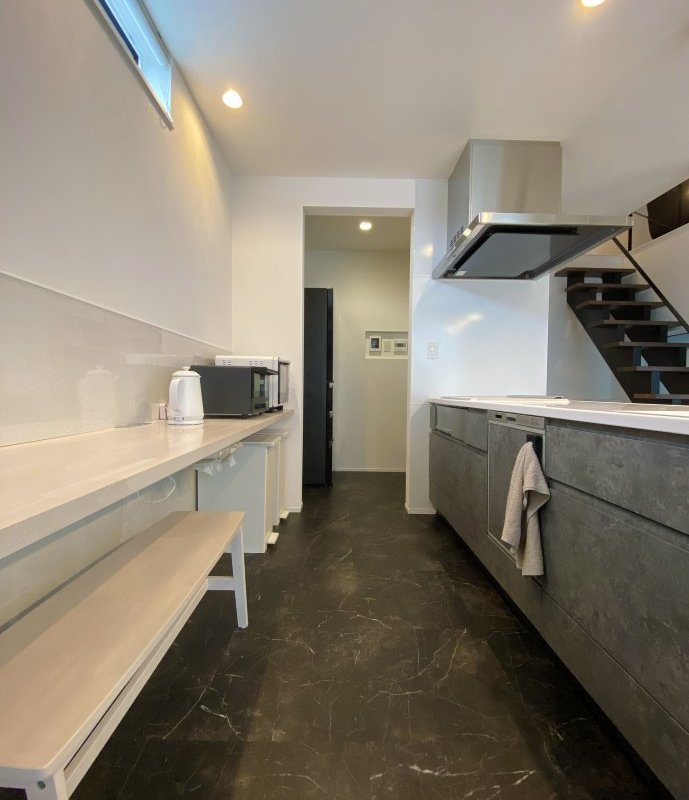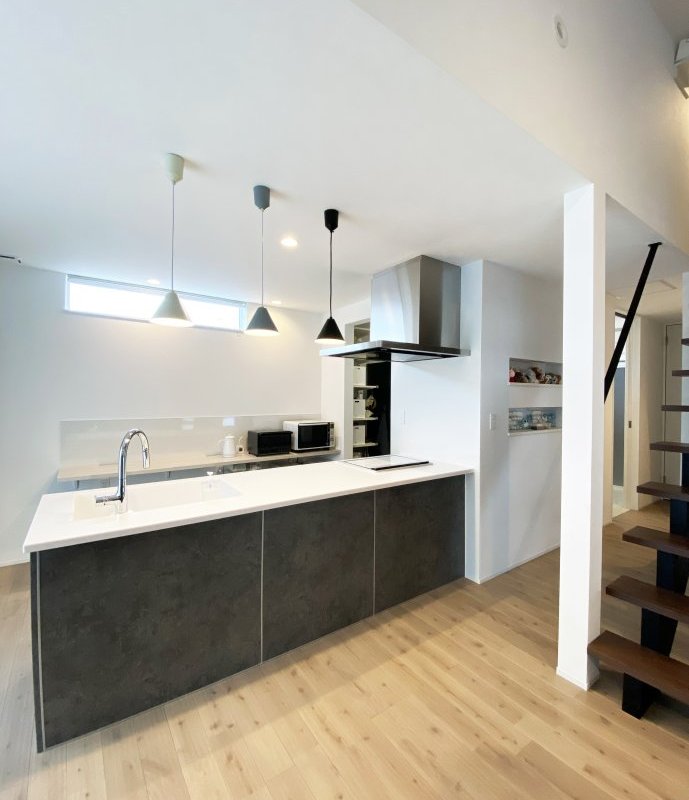統一感を考えたキッチン/モダンでシックなグレーがホテルライクを演出