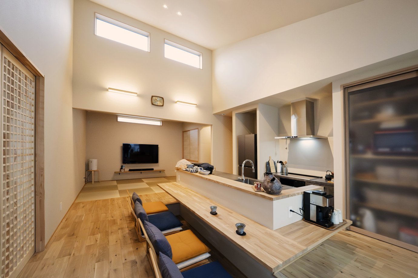 和の趣をふんだんに取り入れたモダンな平屋/掘り下げキッチンと造作カウンターが雰囲気アップ