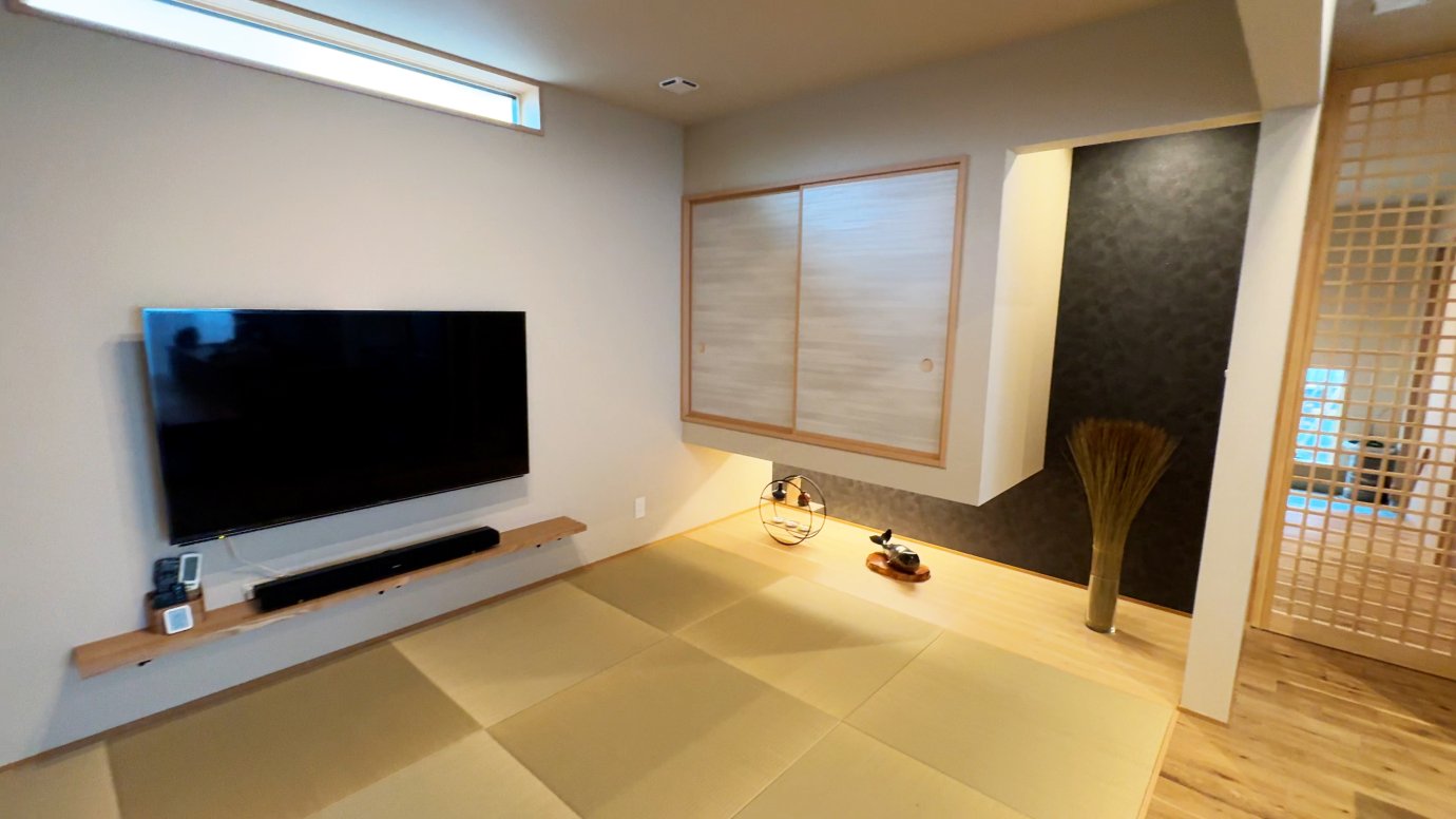 LDKから続くスペースに、趣の異なる和室が似合うのも不思議です。下がり壁で仕切った和室の畳はヘリ無しタイプで織り目を交互に配置することで、特別な空間としての演出がなされています。さらに床の間と一体になった吊り下げ収納タイプの押し入れでスペースを有効に活用でき、そこに間接照明を取り入れることで、とってもモダンな雰囲気となっています。