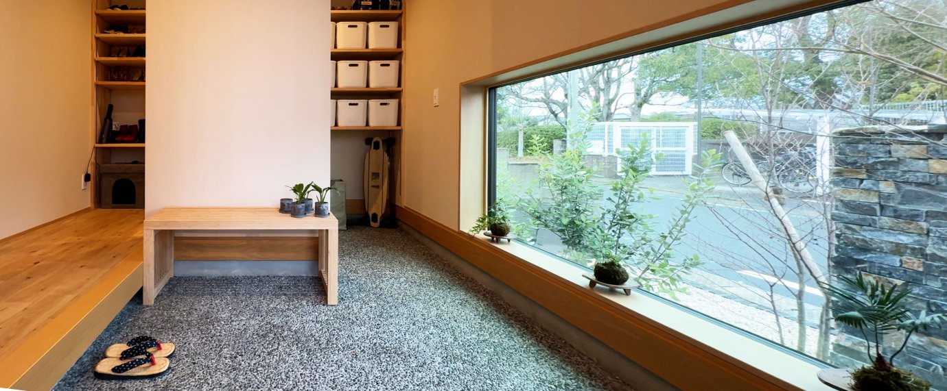 雪見窓もあって、広くて、明るい、開放的な玄関は、来客の際は手前側から入ってもらえる2way仕様。