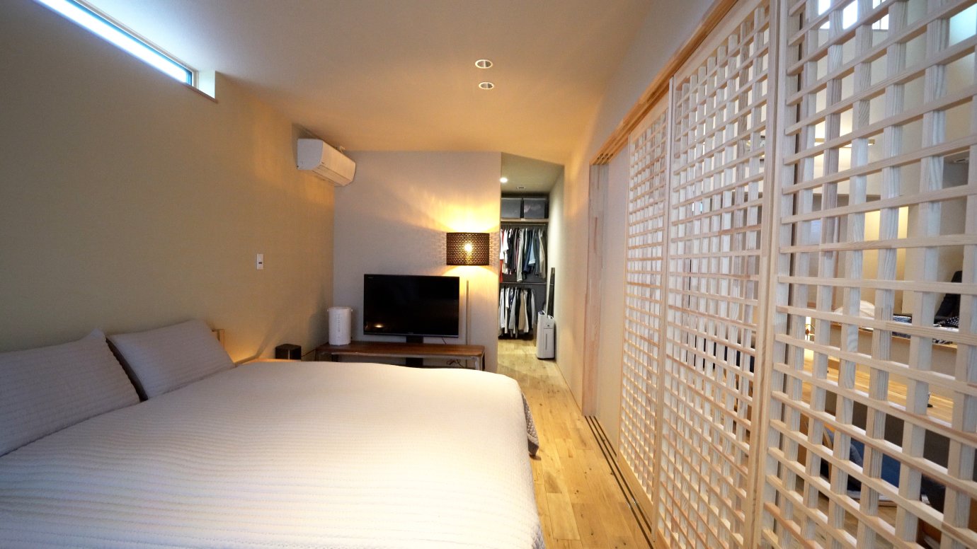 引き戸で区切ることで、リビングと統一感を持たせながらも、寝室をプライベート空間に◎