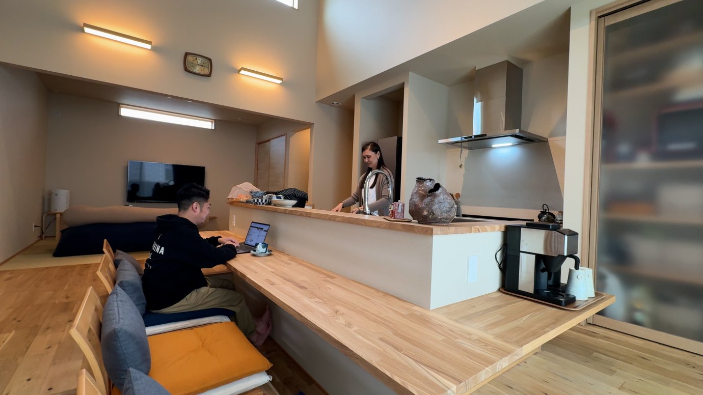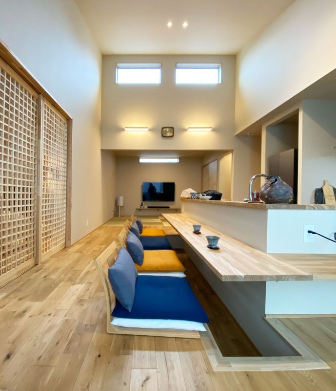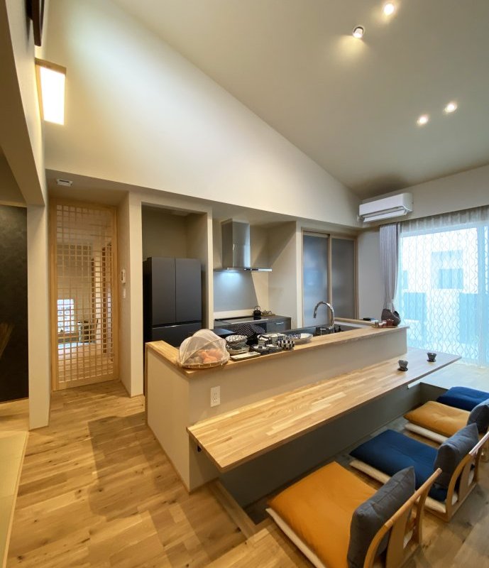 キッチンで料理をしながら、カウンターでは座椅子に座り、目線を合わせて会話することができる造りで、とっても良い雰囲気です。
