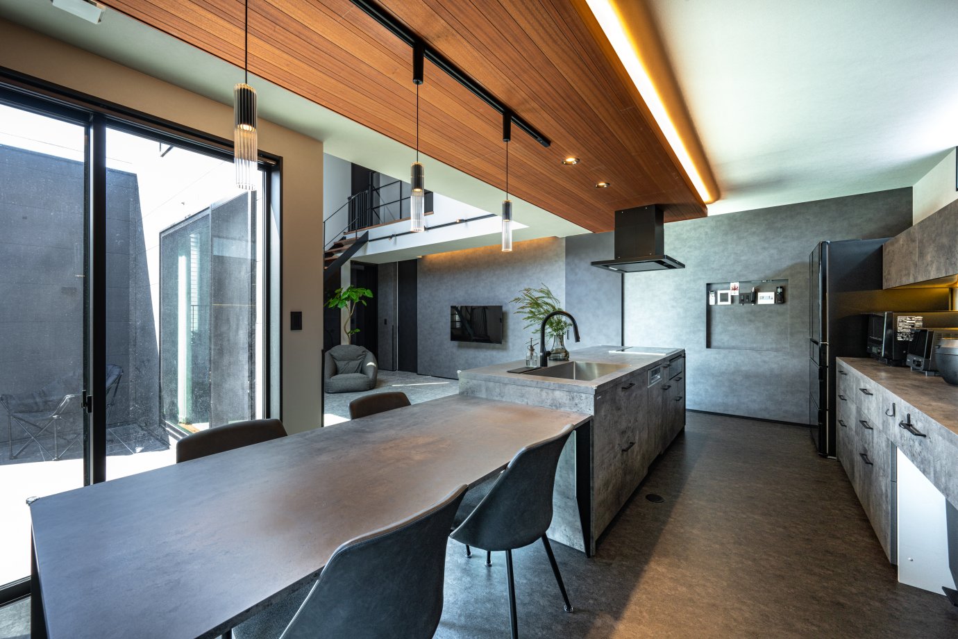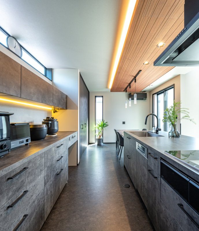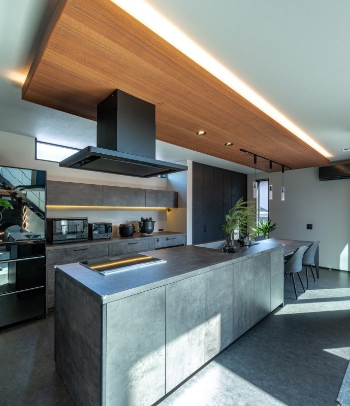 デザイン天井や間接照明に彩られたダイニング・キッチン。インテリアのように美しいグラフテクトのキッチンは、機能性とデザイン性が両立したもの。ホテルライクに欠かせない黒やグレーなどの落ち着いた色味と、下がり天井のやさしい木の温もりがマッチ。間接照明やスッキリ収納で生活感を見せない工夫がさらにホテルライク感をアップさせています。