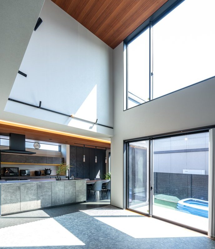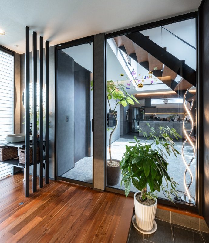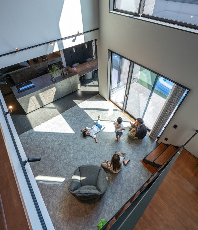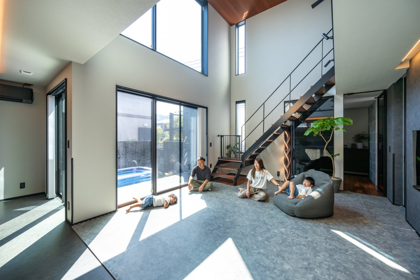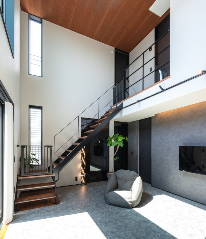 《ホテルライク》吹抜けリビング、スケルトンの扉、ムーディーな照明で特別感を味わえるカッコいいデザインの家