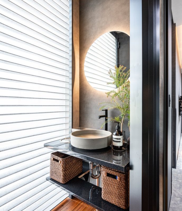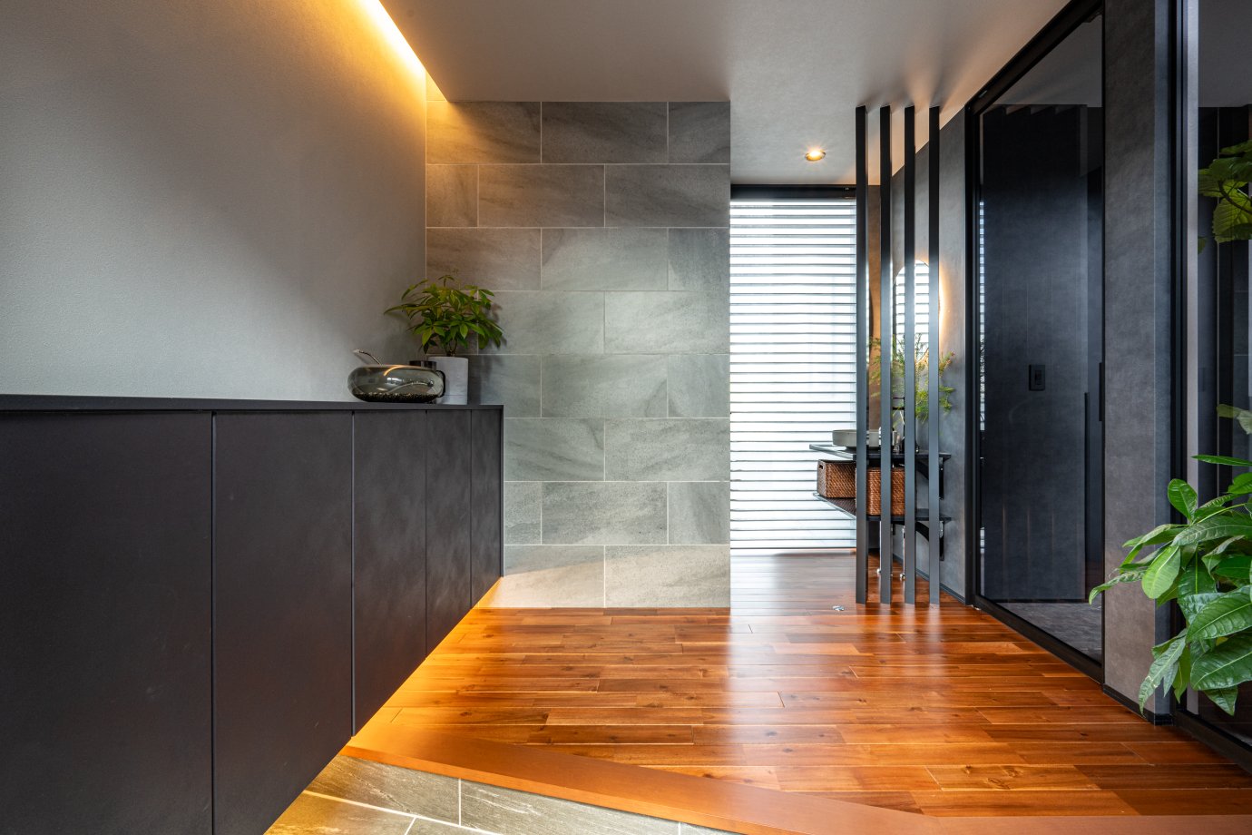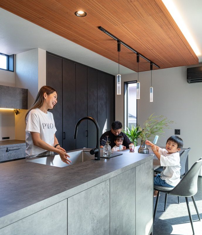 「家づくりは人生の一大イベントだけに、妥協はしたくなかったですね。私たちの理想である『ホテルライク』をキーワードに、何十社ものビルダーを探しました。そのなかで出会ったのが、自由度が高く、担当者の対応や予算面にも納得ができる悠悠ホーム。夏涼しく、冬あたたかい空間を叶える外断熱工法や、家中すべての蛇口から出るクリーンな水も魅力に感じたポイントです。依頼が決まってからは、丁寧なヒアリングで私たちの声に耳を傾け、初回から希望通りの間取りを提案してくれました。子どもの独立後に1階だけで暮らしが完結する居室の配置や家事の効率化を図る水まわり、生活動線上にある設備や収納など、間取りはファーストプランをほぼそのまま採用。そのうえで、黒×グレー×木を基調とした色づかいと調光可能な間接照明、スケルトンの建具などをバランスよく取り入れて、高級ホテルのようなラグジュアリーな空間を創りあげてくれました」とお話しいただきました。