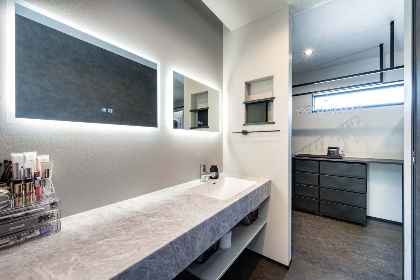 アイカ工業の洗面台と持ち込みの鏡でご夫婦好みに仕上げた洗面スペース。ドレッサーも兼ねており、忙しい朝に重宝する