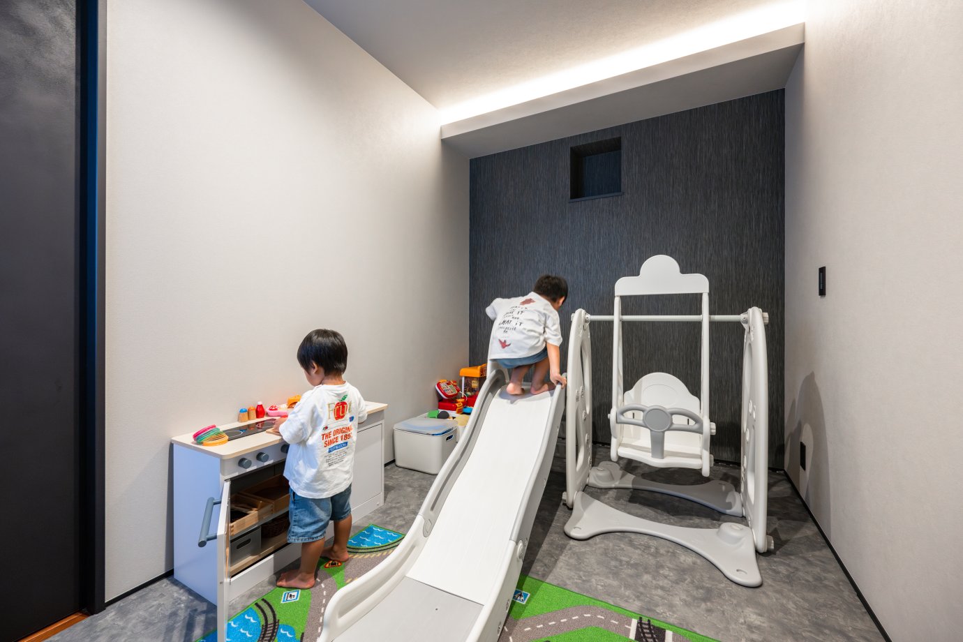 リビングとウォークインクローゼットから出入りできる洋室。子どもたちが小さいうちはリビングから目が届くプレイルームとして活用。いずれはスクリーンやプロジェクターを設置して、寝ながら映画を楽しめるホームシアターにする予定
