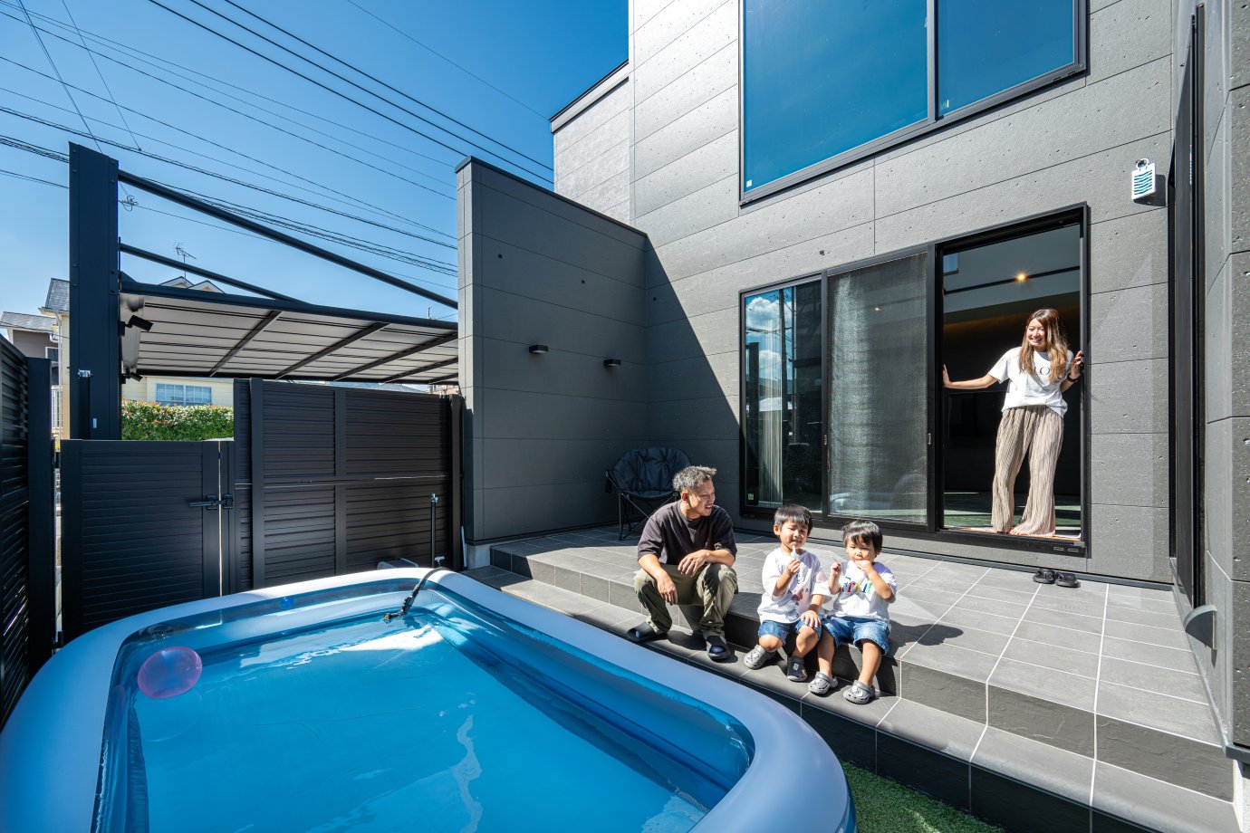 通り側に壁を設けた、プライベート感たっぷりの中庭。悠悠ホームの家には、家中の水をミネラルウォーターで提供する「浄水活水器(ウェルネス*ぷらす 潤re)」を採用しているので、飲料水はもちろん、家庭用プールや菜園にもキレイな水を使える