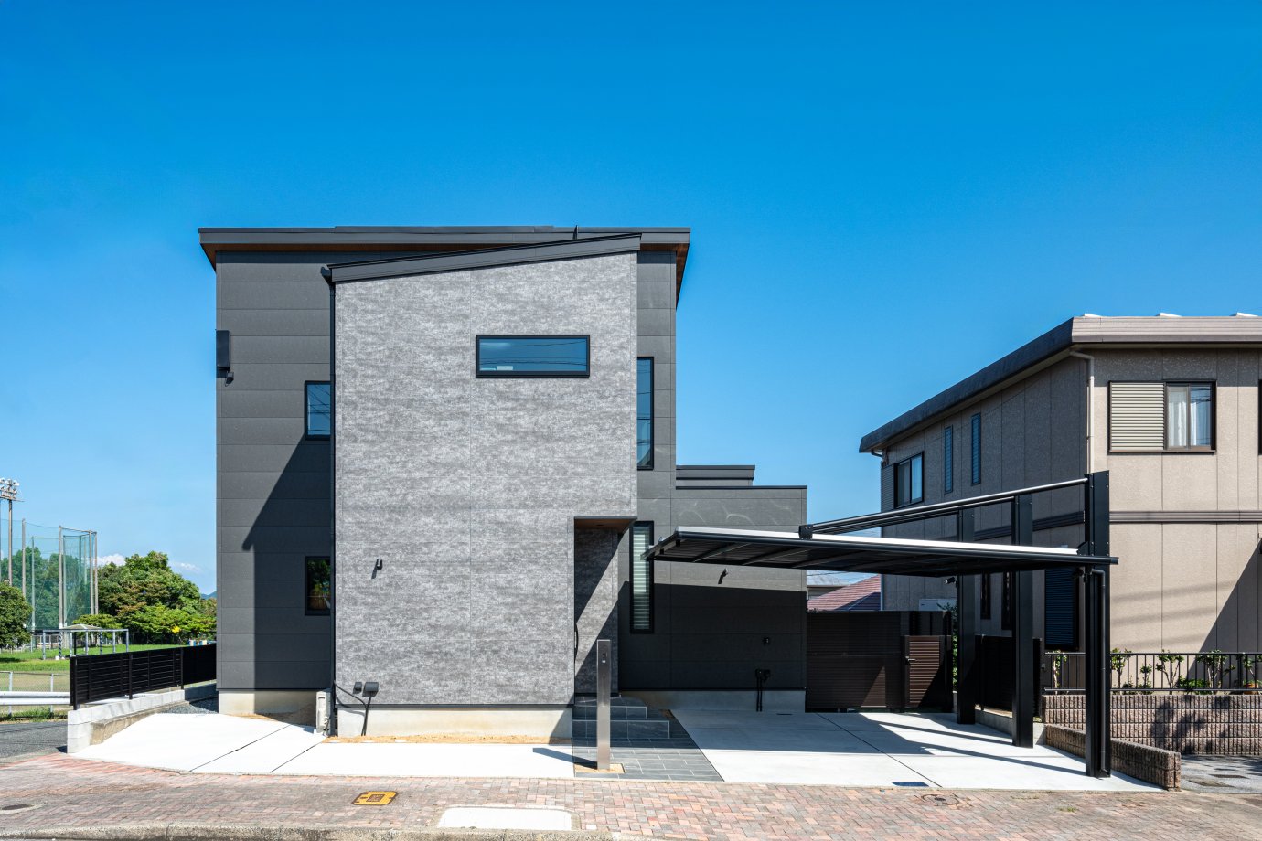 正面からはBOX型の建物が連なっているように、斜めから見ると様々な方向に勾配を付けた屋根が独特のフォルムを描く外観。屋根の上には、月々のランニングコストを軽減する太陽光発電システムを搭載している