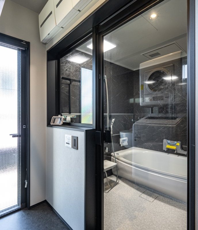 スケルトンの扉を採用したバスルーム。ハイクラスホテルへ宿泊しているような感覚で、1日の疲れをゆったりと癒している