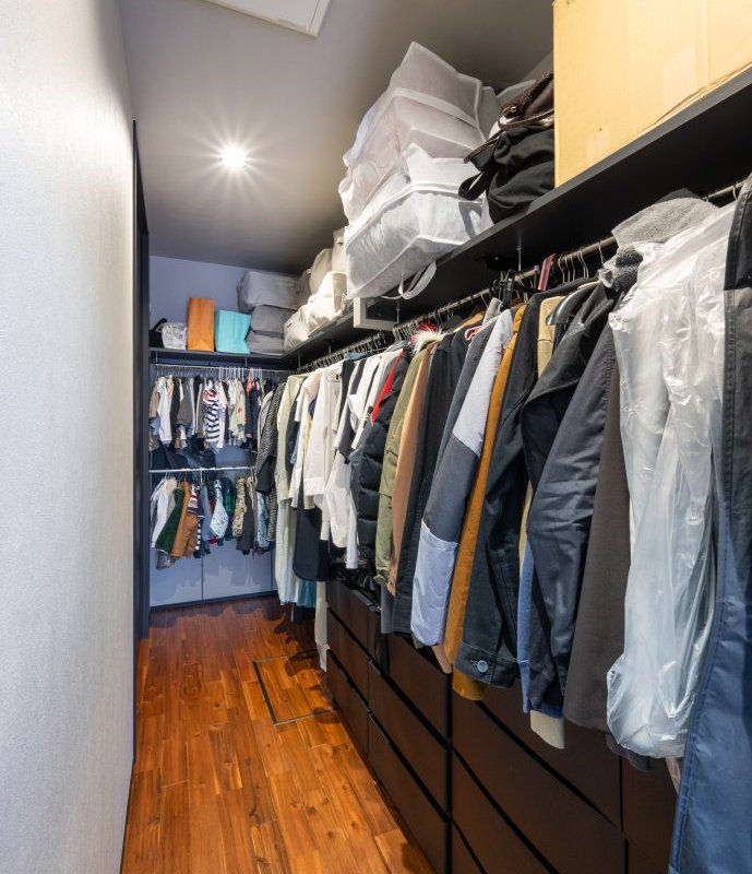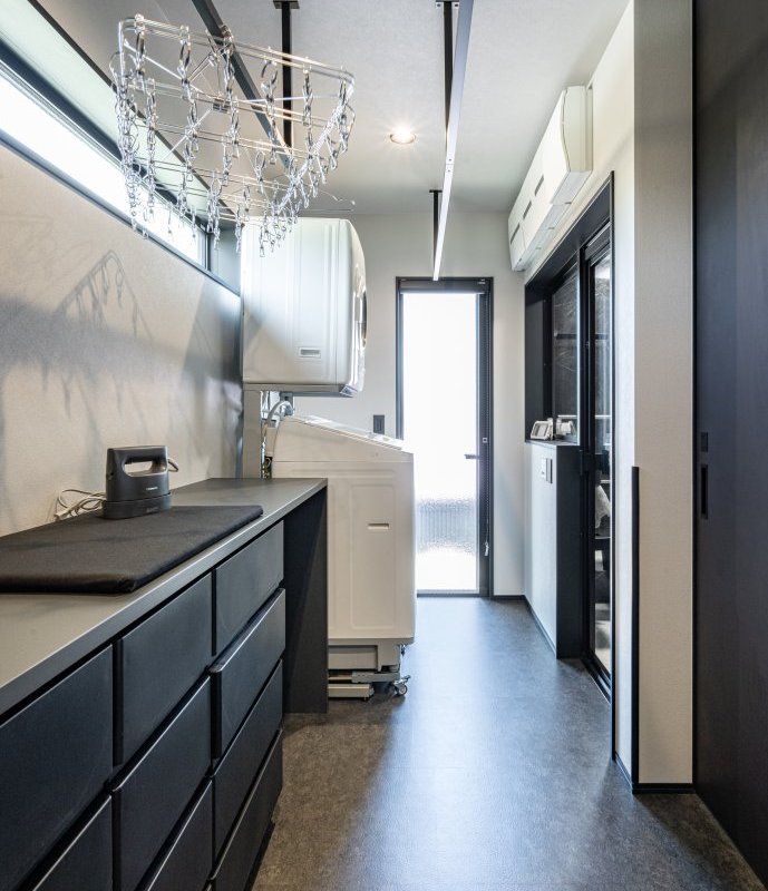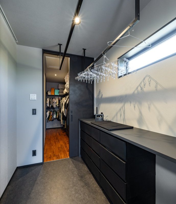 室内干しや衣類畳み、アイロン掛けなど、多機能空間となる脱衣室とウォークインクローゼットを横並びに配置。洗う・干す・畳む・仕舞うという洗濯一連の作業がスムーズに行える