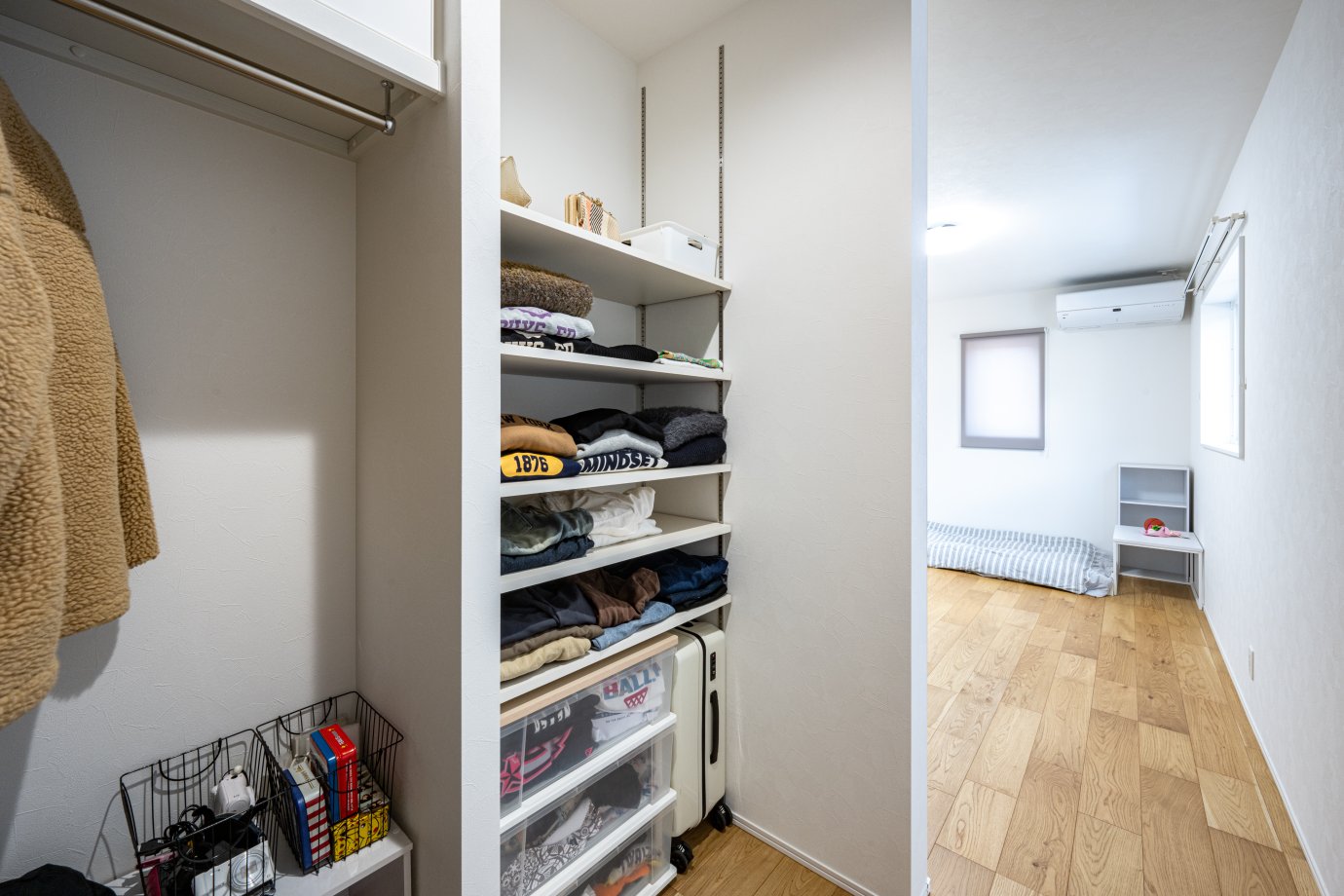 娘の部屋は広々としたウォークインクローゼット付。可動棚やL字のパイプハンガーなど、機能的な仕様で収納力も抜群だ