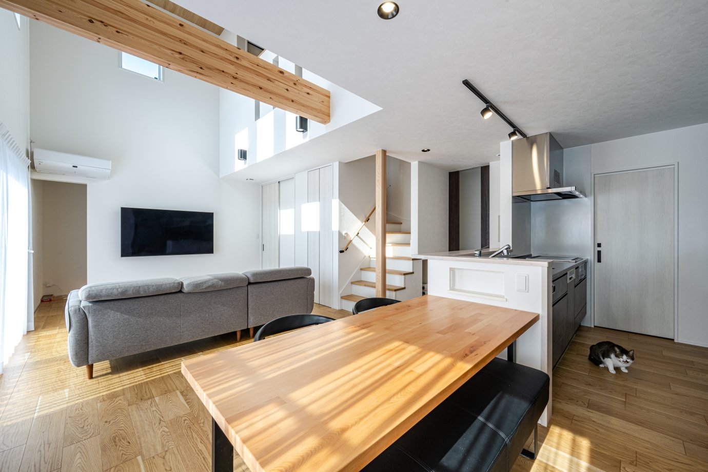 家族と愛猫がくつろぐ、明るく開放的な吹抜けのリビング〜土地探しのサポートから、プロ目線の設計アドバイスまで、安心の対応力に惹かれて〜