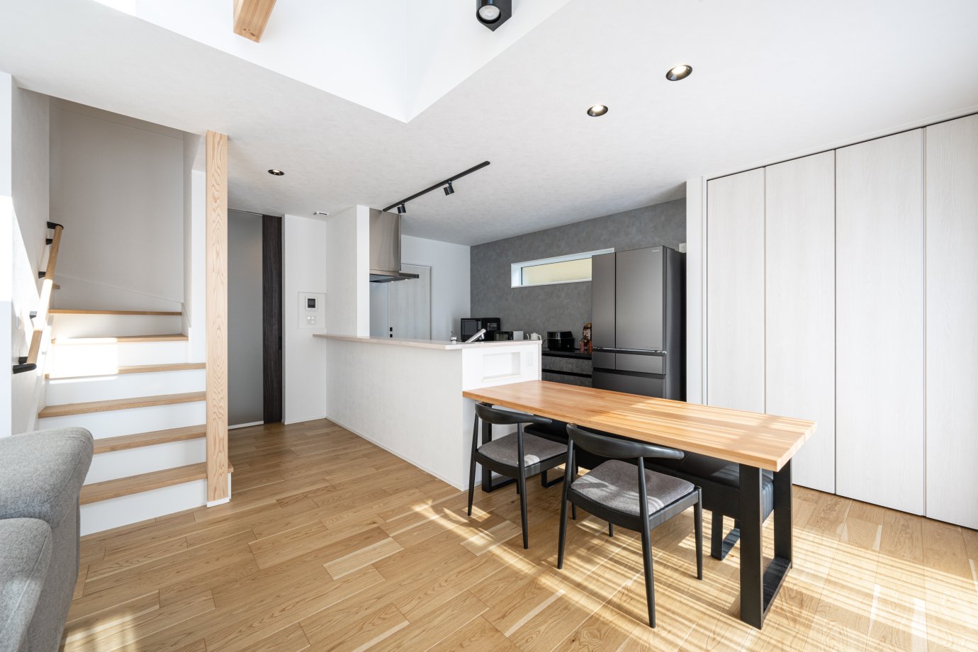 ホワイト✖️木のぬくもりが心地良い空間全体を白でまとめることで、視覚的な広がりも感じられるLDK。ダイニング・キッチンとリビングスペースは、天井の高さを変えて空間にメリハリをつけている