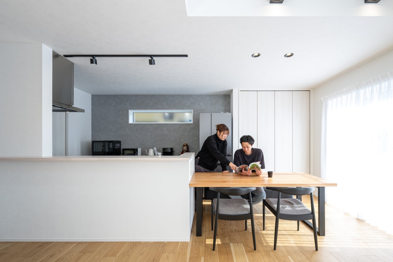 家事ラク〜調理した料理をサッと運べる間取り〜横並びのダイニングキッチンは橋本さまのご要望。できあがった料理を渡しやすく、食後の片付けも以前の家に比べてかなり楽になったという