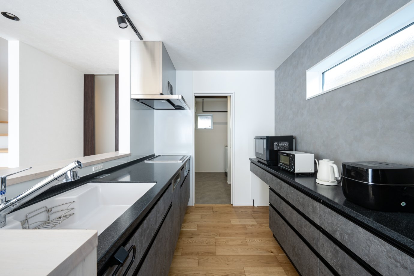 料理⇄洗濯が簡単!時短できる動線キッチンから洗面脱衣室を直線状に配置した水まわり。横の動きだけで料理と洗濯を同時進行できるから、効率よく動けるという