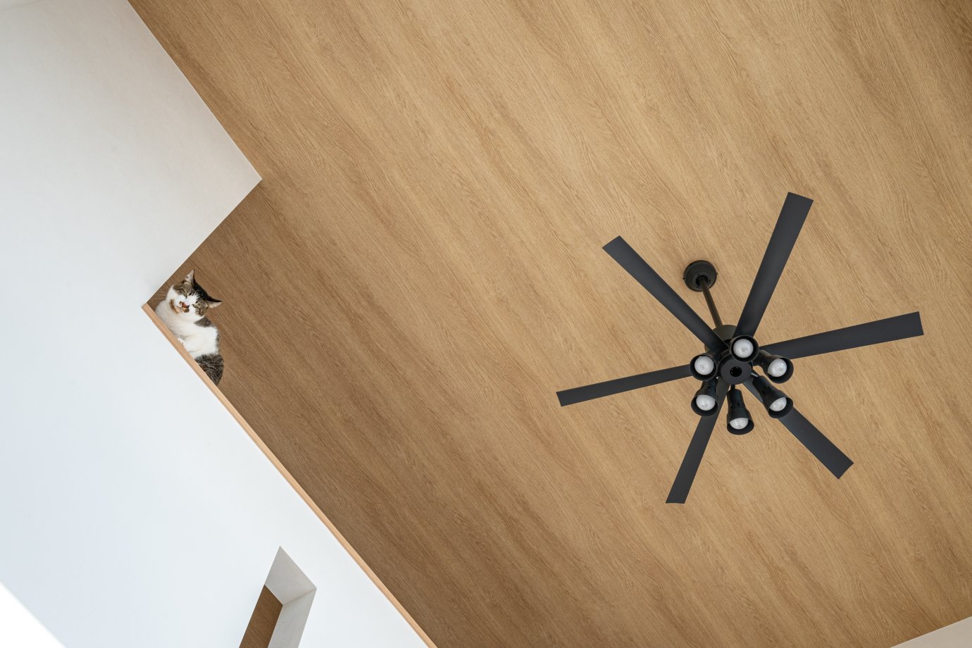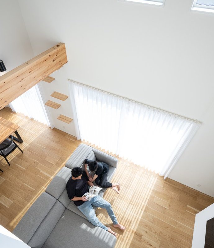 憧れの吹抜けリビングで、家族が思い思いの時間を過ごし、猫が自由に歩き回る橋本様邸。南面の明るさを最大限に活かした開口計画によって、日中は自然光だけで照明要らずの心地よさを叶えていた。