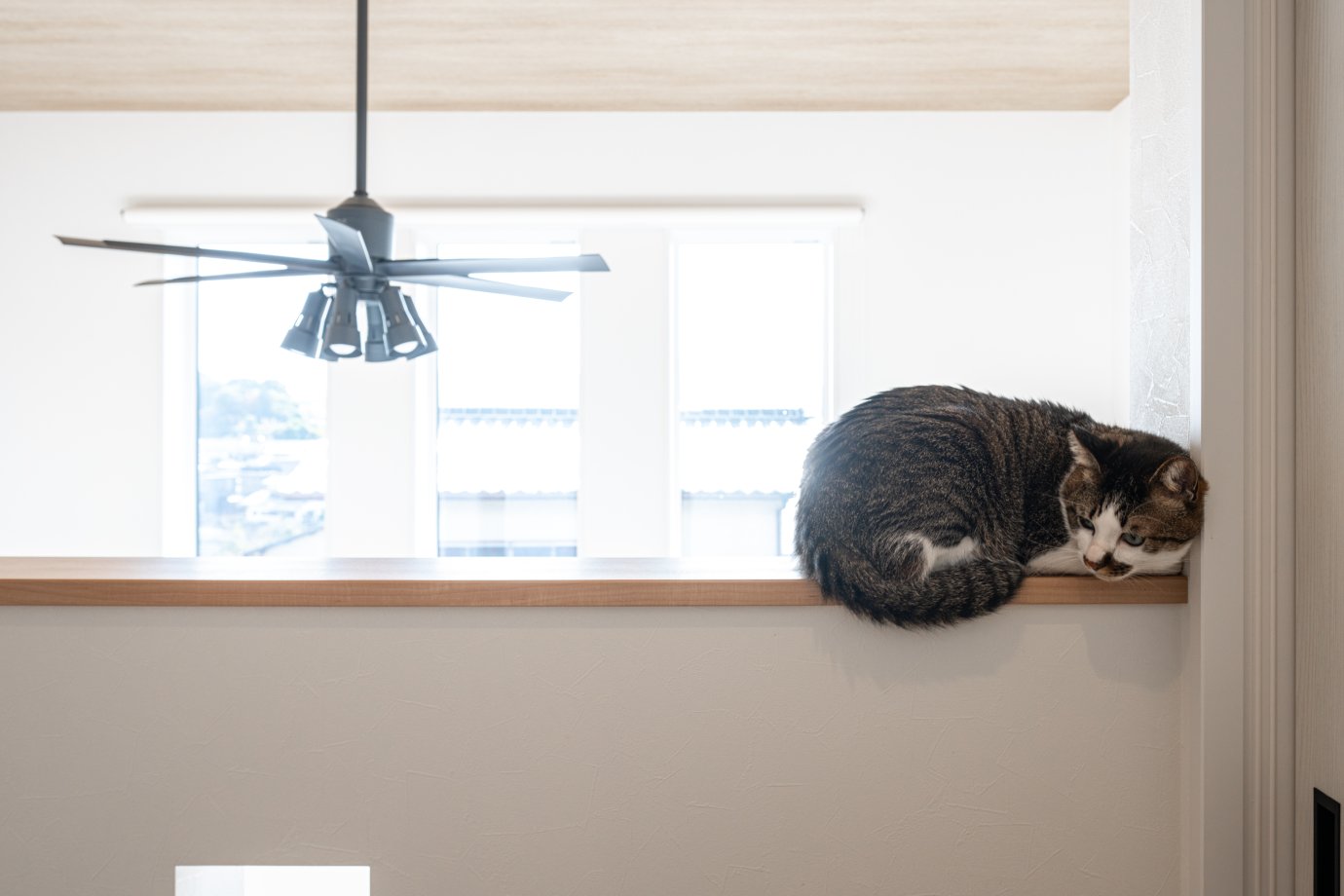 以前の住まいでは、冬の寒さや結露に悩まされていたそうだが、猛暑の日に同社のモデルハウスを訪れた際、エアコン1台で室内が快適だった点も魅力に感じたポイントだという。家づくりで重点を置いたのは、家族が好きな場所で過ごせる広々とした吹抜けリビングと、将来夫婦ふたり暮らしになった際に1階だけで暮らしが完結する間取り。長く過ごす家だからこそ、家事動線や収納にもこだわり、さまざまな要望を挙げたという。さらに、キャットウォークや猫部屋まで設けて、家族5人と愛猫が快適に過ごせる空間を実現。休日には夫のバスケット仲間も集まり、好きな場所で寛ぎながら、食事や会話を楽しんでいるそうだ。