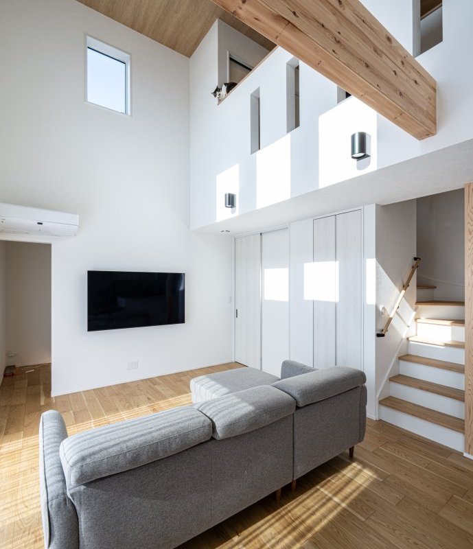 家族と愛猫がくつろぐ、明るく開放的な吹抜けリビングのある家