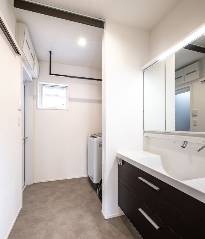 室内干しを来客に見せない工夫室内干しができる脱衣室(奥)と洗面室(手前)の間にロールカーテンを設置。カーテンで仕切れば来客時にプライベートな部分を見られることがない。また、家族の入浴中も気兼ねなく洗面台を使える