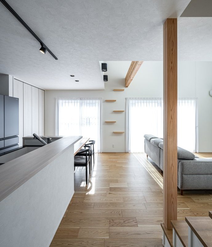キャットウォークで愛猫が楽しめる空間大きな吹抜けのリビングを中心に1・2階が繋がり、コミュニケーションもとりやすい。キャットウォークを兼ねた梁で、愛猫も喜ぶ住まいを実現