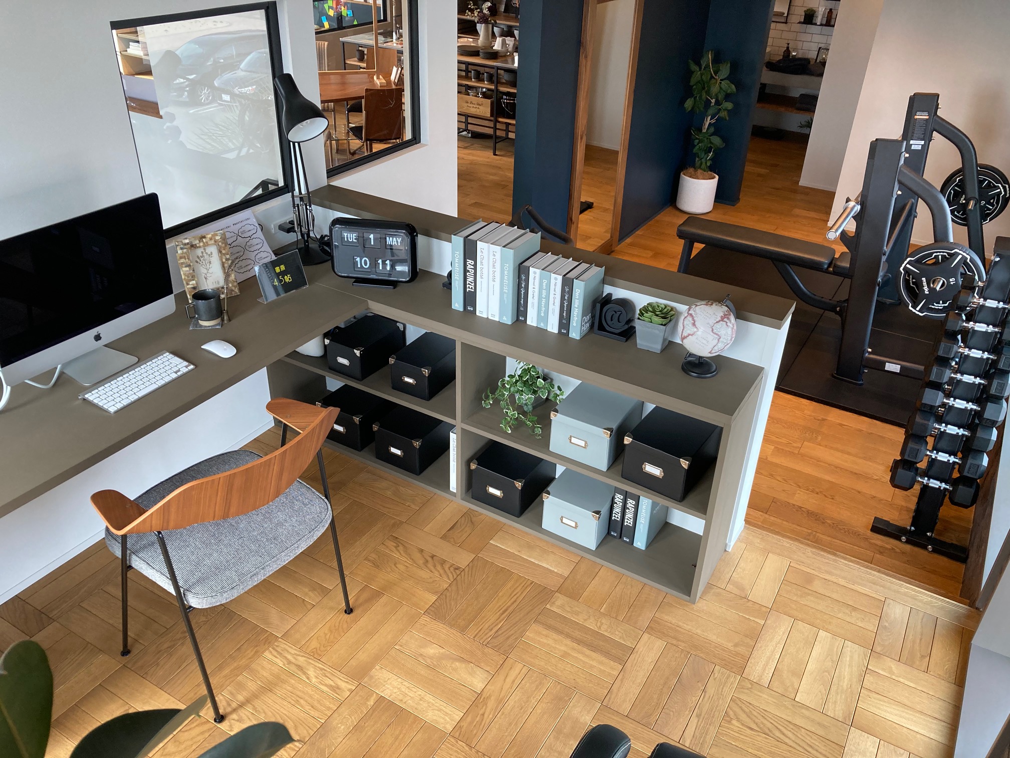 次にご紹介したいのが、書斎スペースです。 このご時世で、ご自宅でリモートワークをされる方も増えたのではないかと思います。 ご自宅でもお仕事に集中しやすい環境を、というご提案の一角です。 先程ご紹介しましたトレーニングルームと隣接しておりますが、段差を付ける事で、独立した空間になっております。 お仕事に疲れたら、息抜きに運動も出来ますね♪ Lashipは、お家時間を充実させる為の工夫がたくさんある展示場になります! 他にもたくさんの見どころがありますので、興味を持たれた方はぜひ、お気軽に遊びに来て下さいね☺